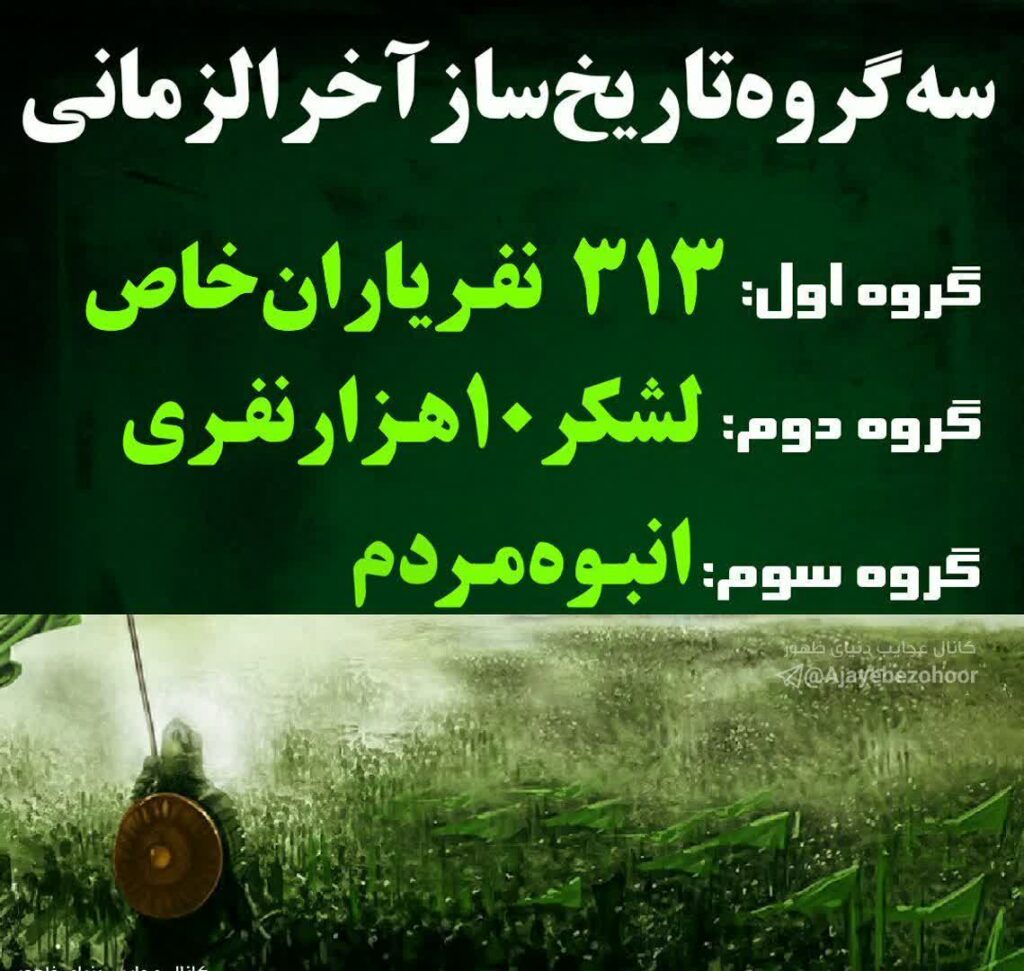 گروه اول: نخستین کسانی که گرد امام جمع میشوند و دعوتِ جهانیِ امام با آنها آغاز میشود؛ ۳۱۳ نفر یاران خاص حضرت هستند که فرماندهان و کارگزاران سپاه ایشان را تشکیل میدهند. امام حسین علیهالسلام فرمودند: و از اصحابش سیصد و سیزده تن به تعداد اصحاب بَدر، از دورترین نقاط زمین به گرد او فراهم آیند.